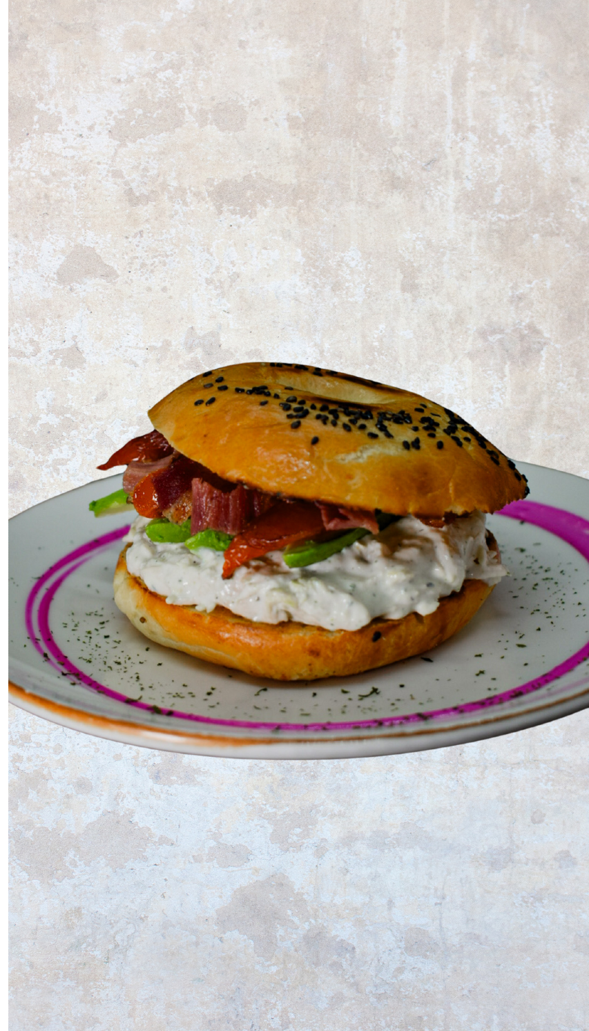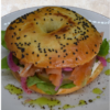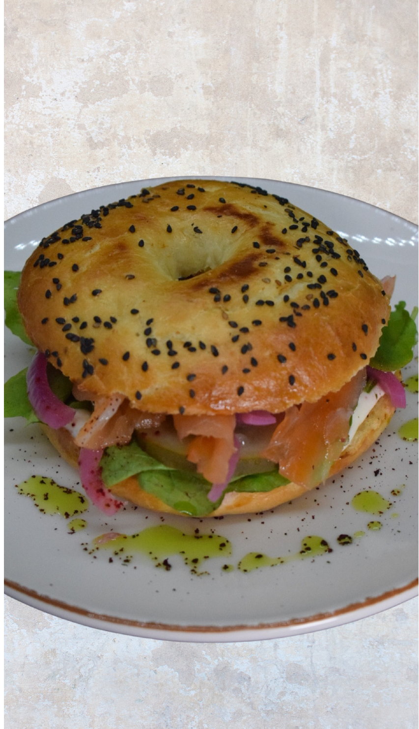 Gravlax de salmón, crema ácida, cebolla y pepinos encurtidos.