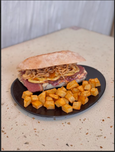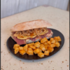 Pan de ciabatta, lechuga, tomate, jamon, queso, huevo y carne acompañado de fritas
