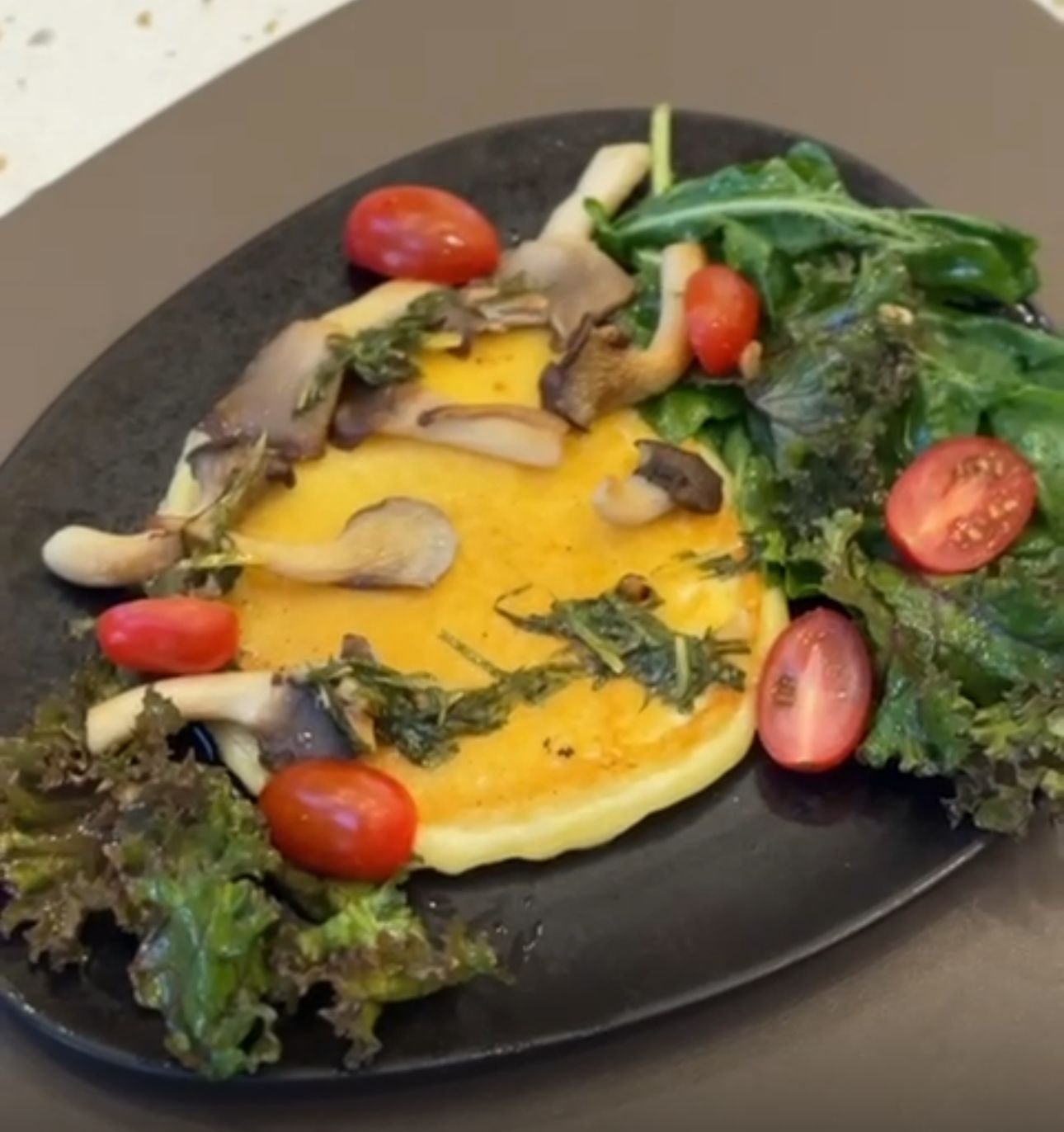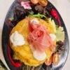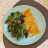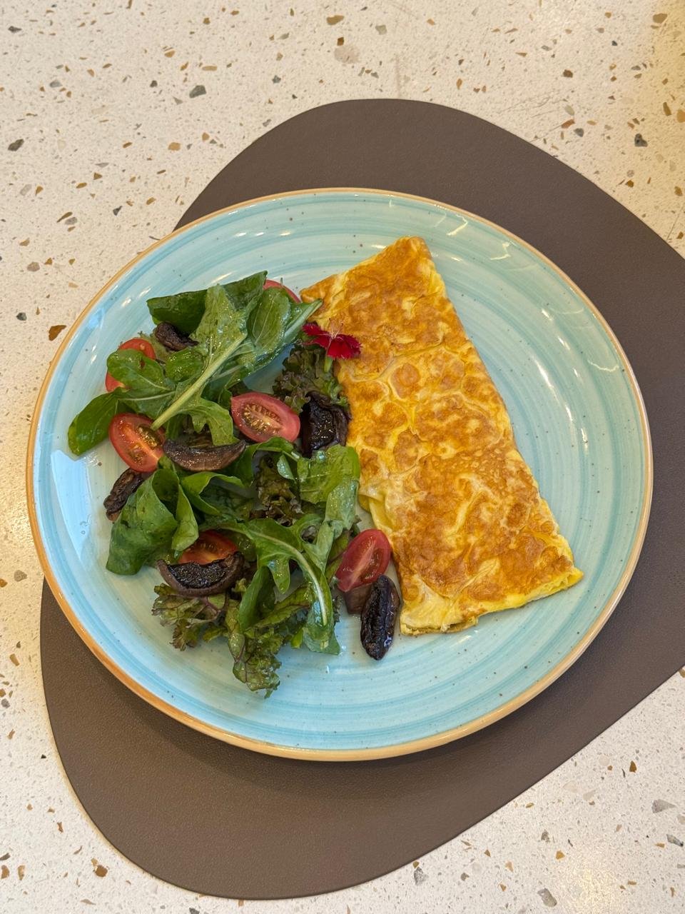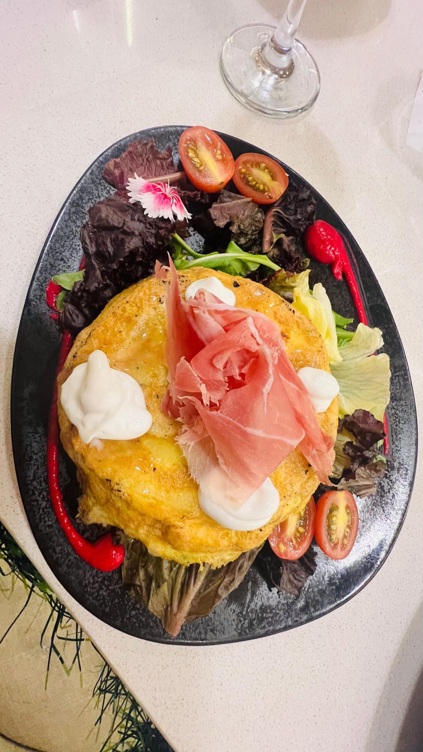 Tortilla de papa estilo española, jamón crudo, cherrys y mix de verdes