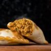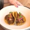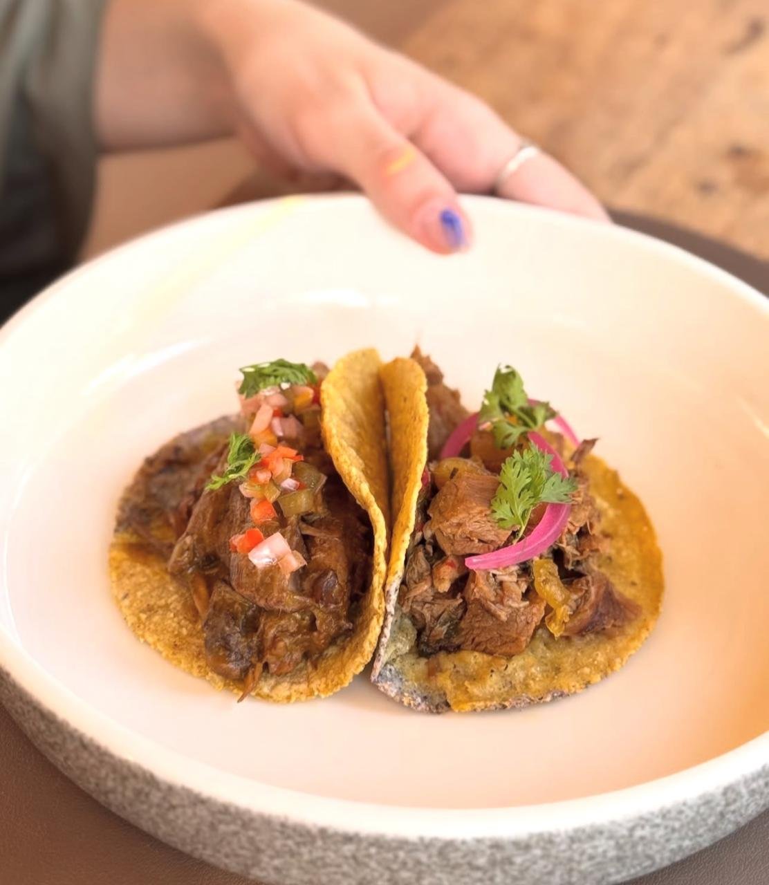 Tortilla de maíz, carne desmechada, cebollas encurtidas,salsa criolla y mermelada de ananá picantito