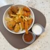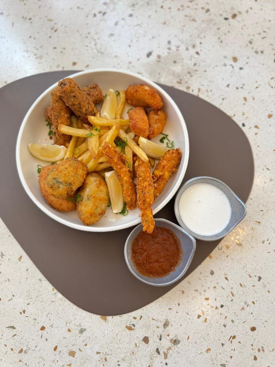 Tiras de pollo crocante, langostinos apanados, croquetas de espinaca, papas fritas y bastones de queso rebosado acompañado con ali-oli y salsa barbacoa