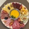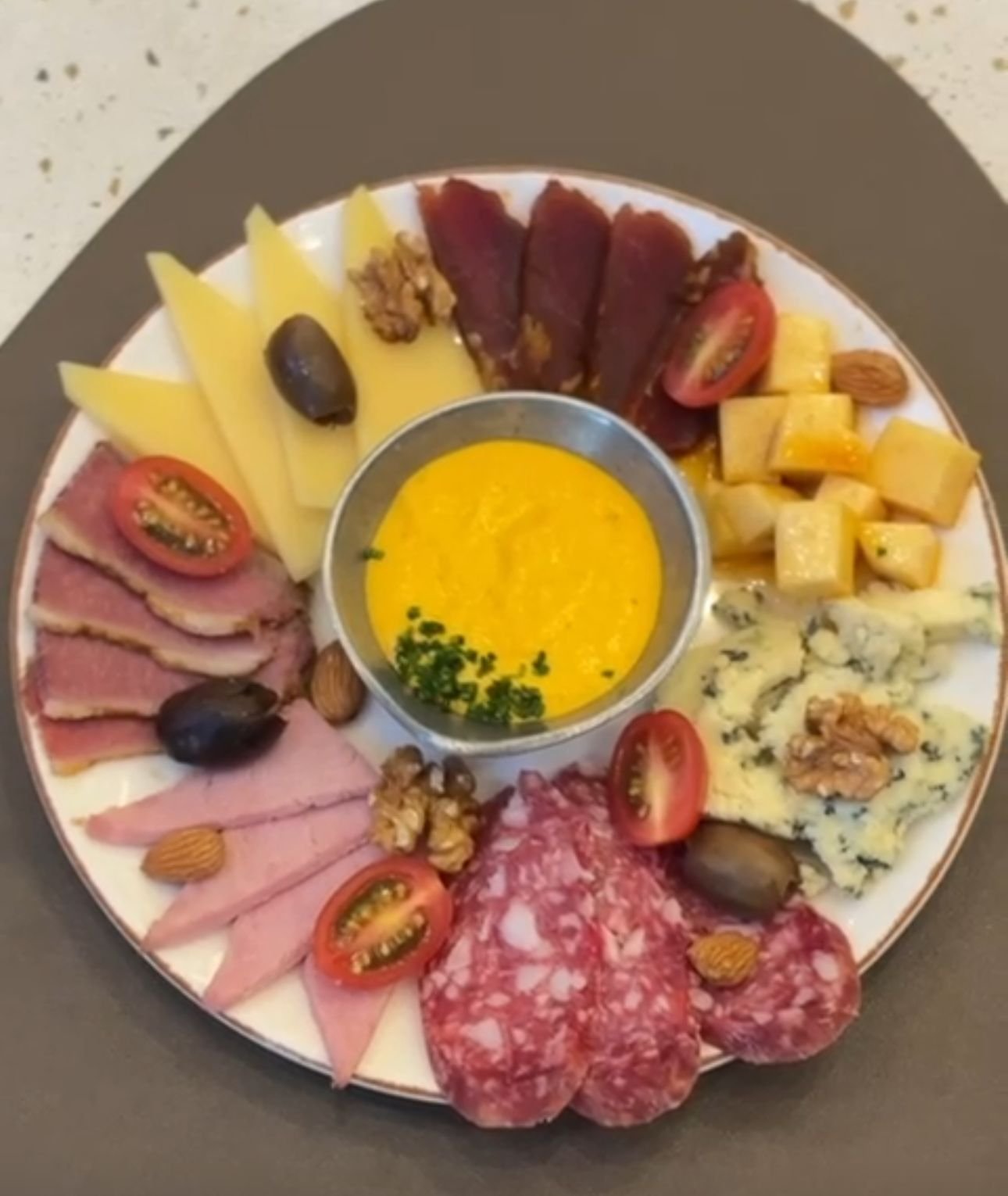 Queso roquefort, tybo marinados, sardo, salame, jamón cocido y pastrón, con nueces, olivas negras y alioli
