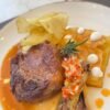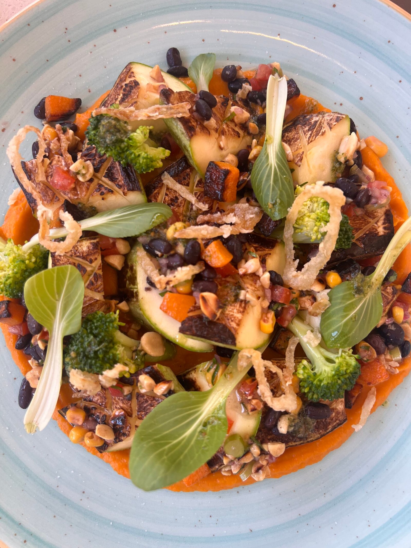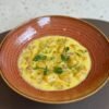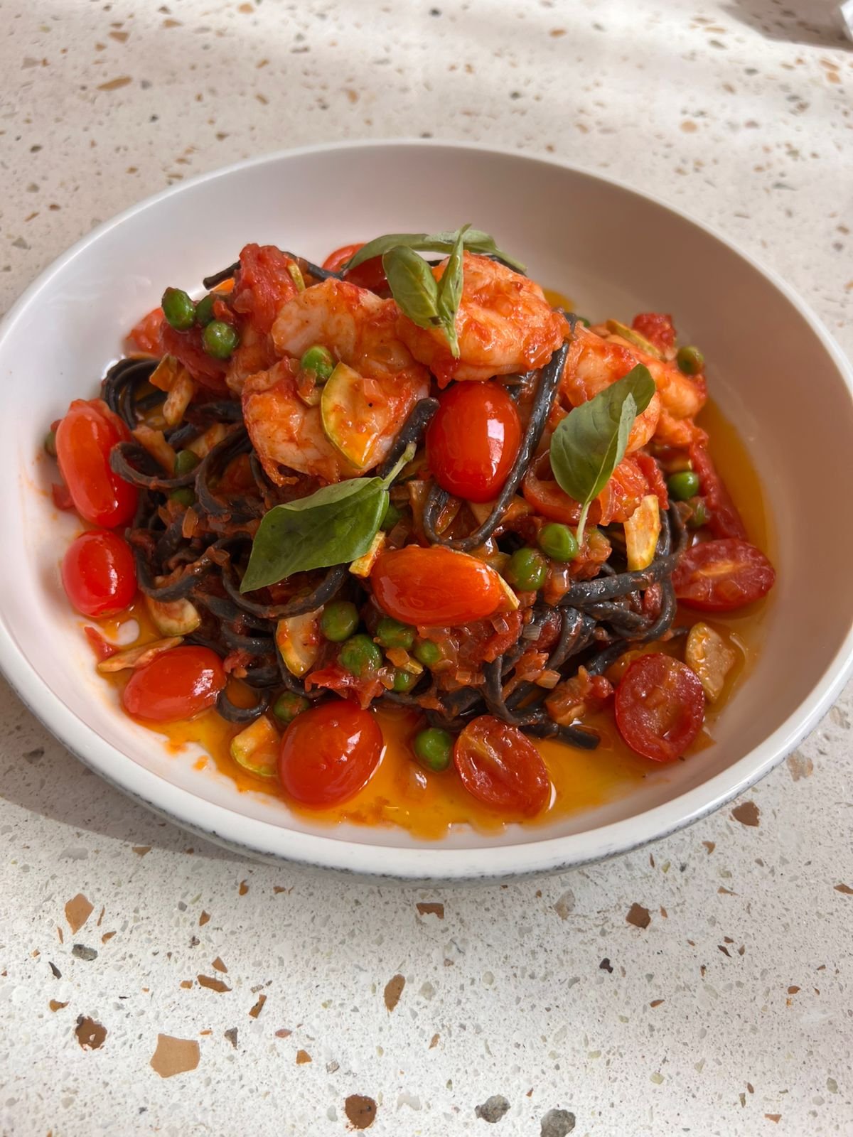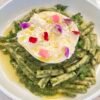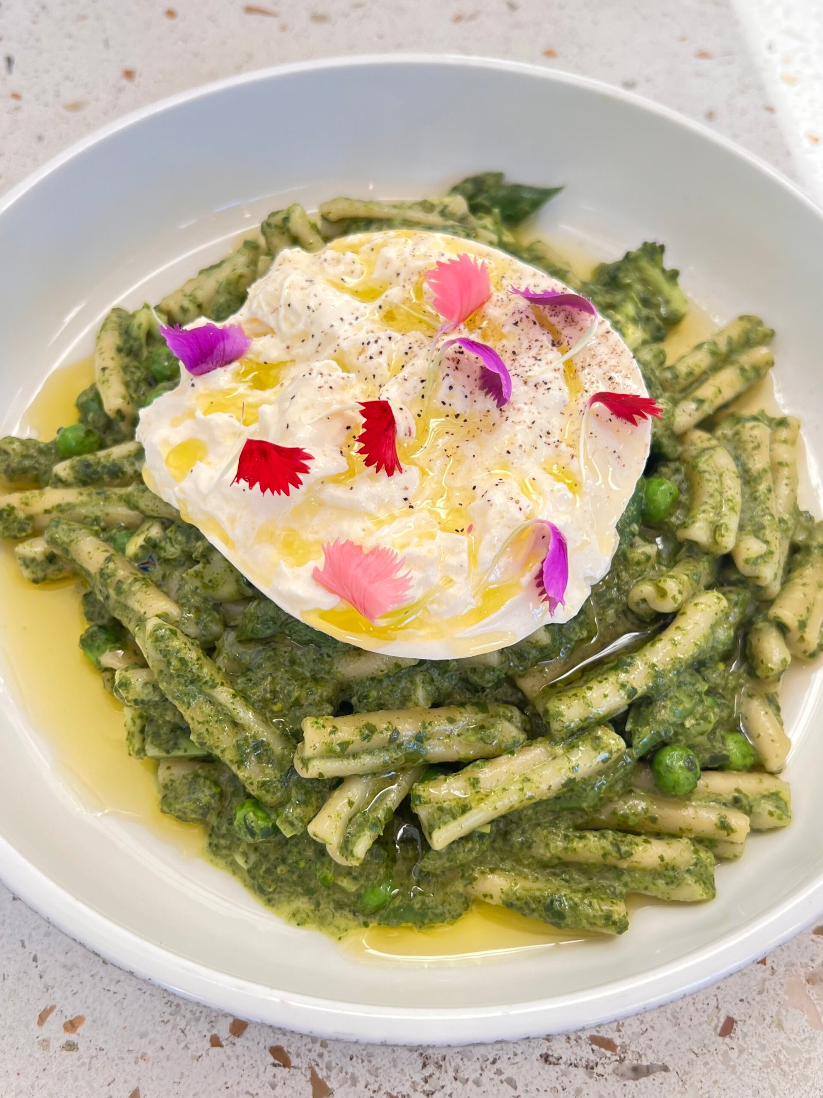 Pasta italiana, Brócoli, arvejas, zucchinis, crema de espinaca y burrata, terminación con aceite de oliva.