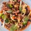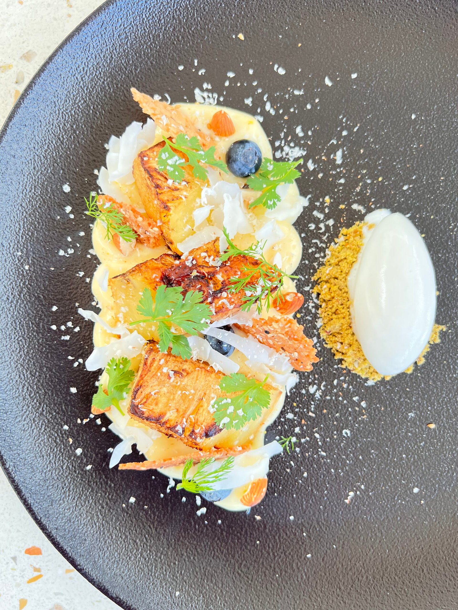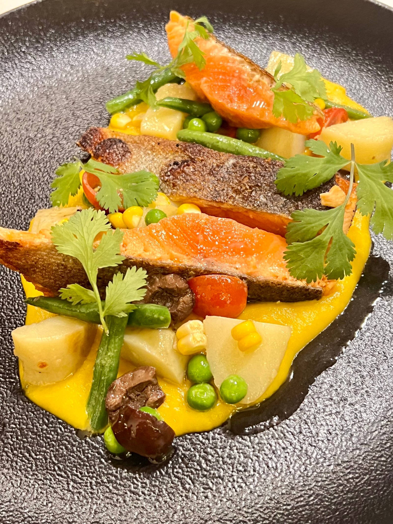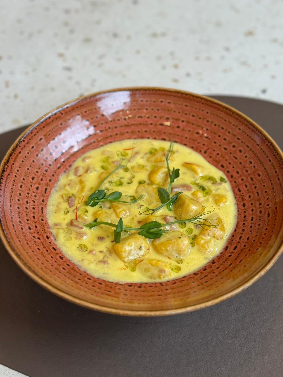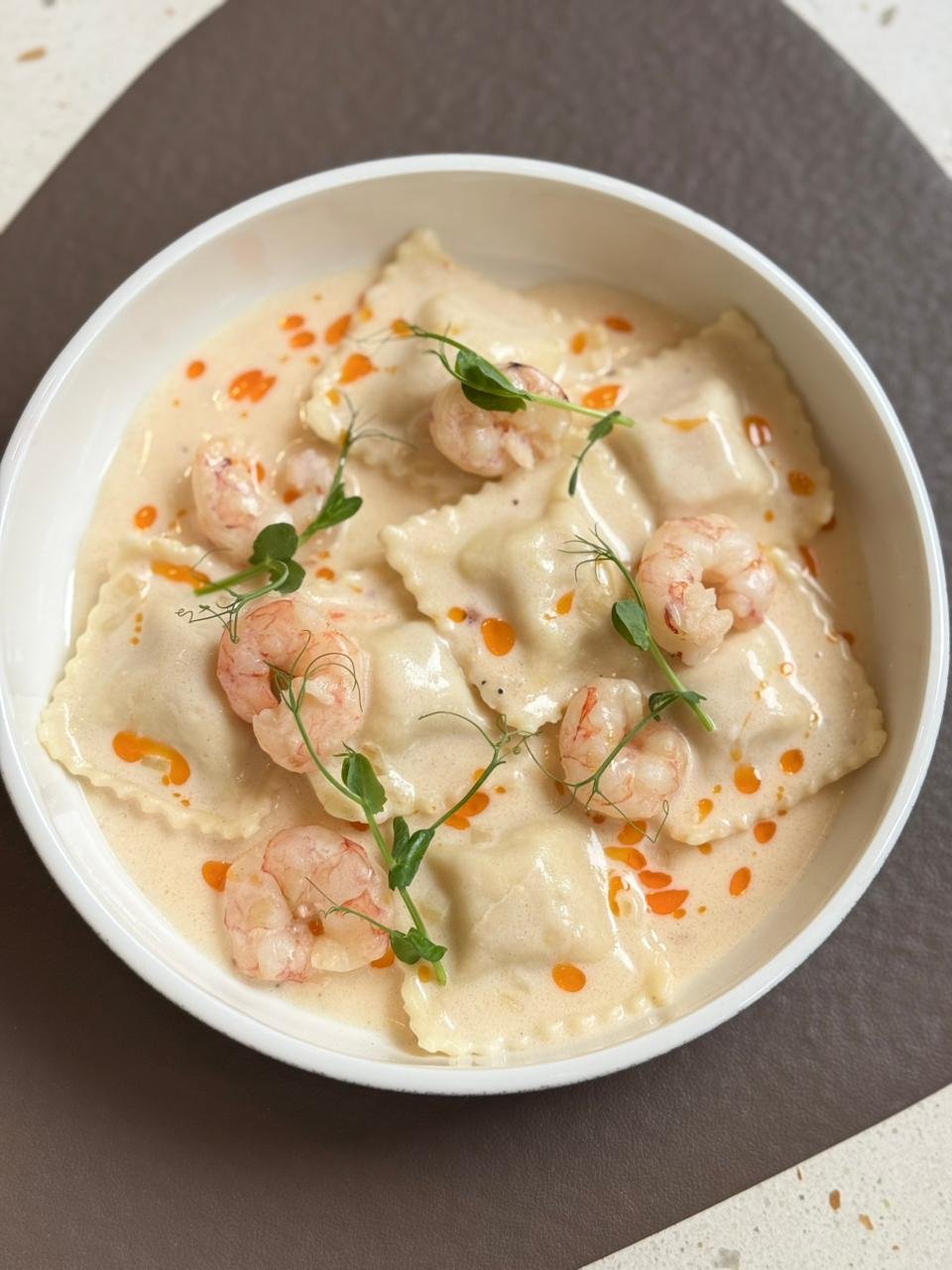Pasta italiana, Brócoli, arvejas, zucchinis, crema de espinaca y burrata, terminación con aceite de oliva.
