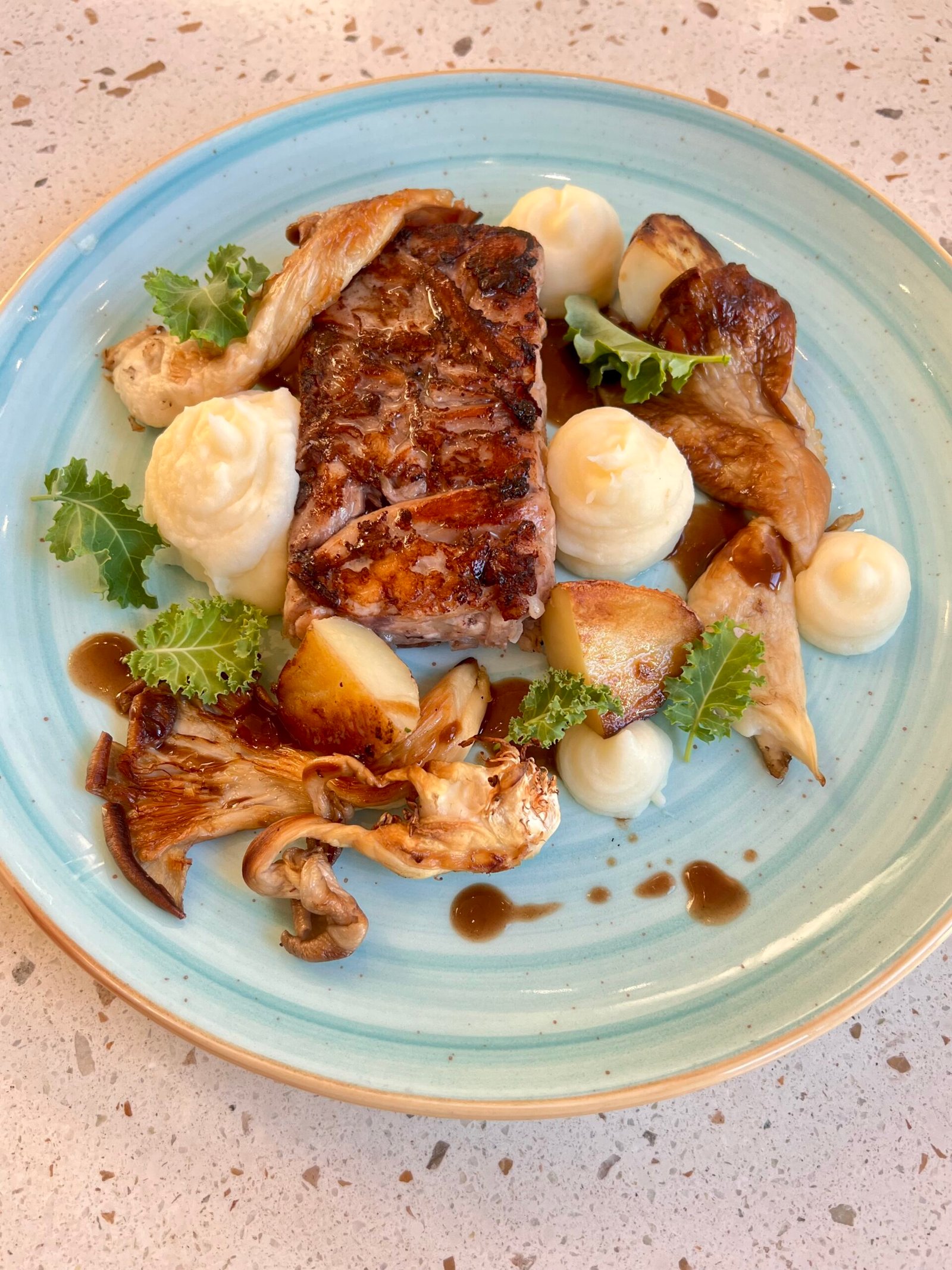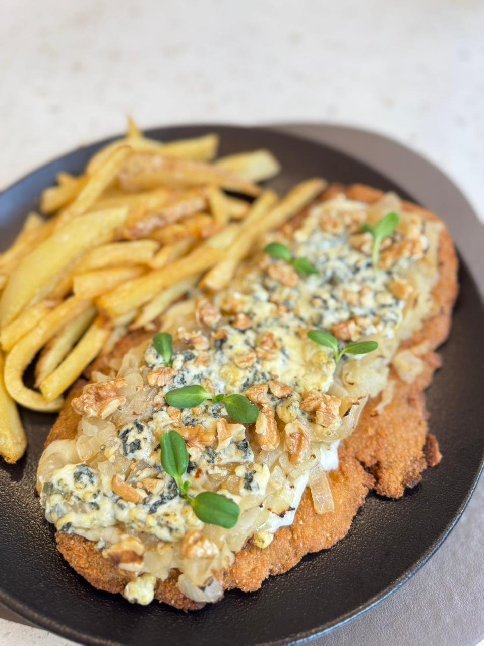Con roquefort, cebolla y nueces, acompañado con fritas, puré o ensalada