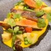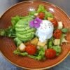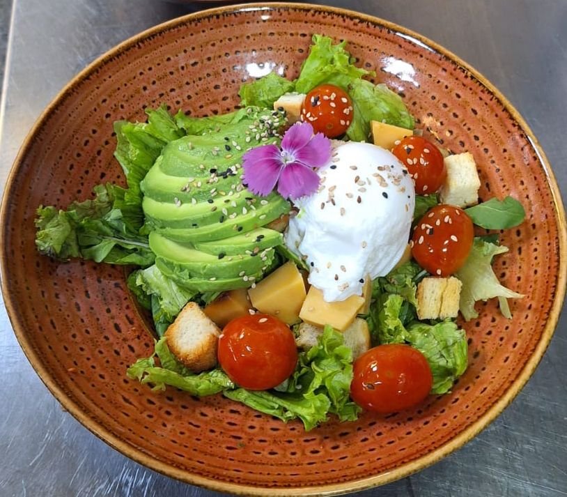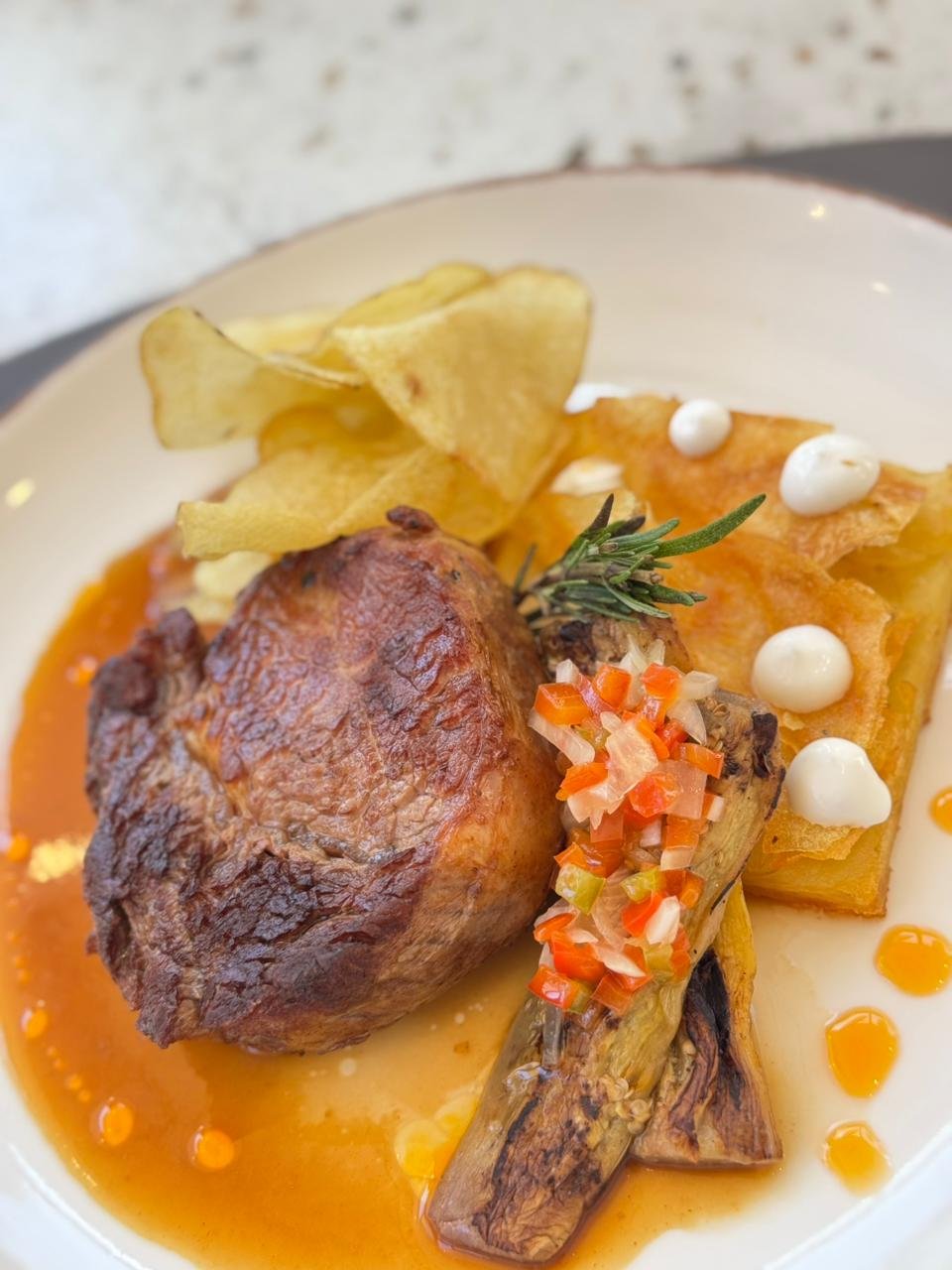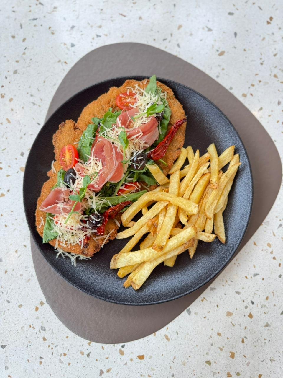 Con Rúcula, tomates cherrys, olivas negras y jamón crudo, acompañado de fritas, puré o ensalada