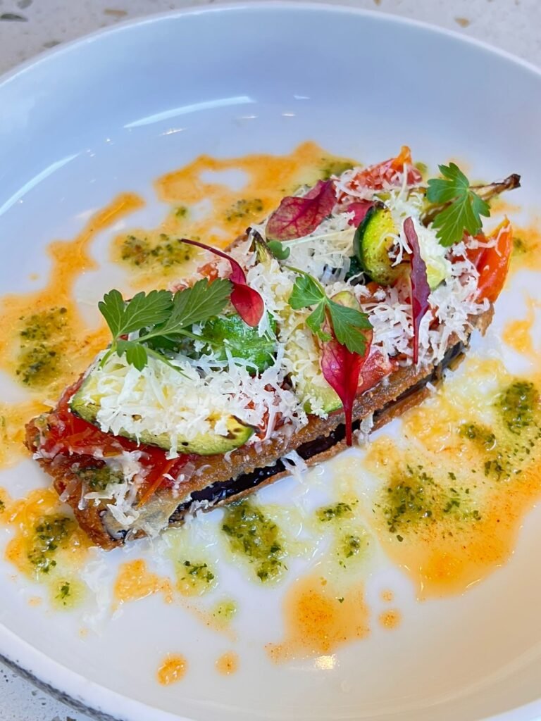 Roll de pez gallo relleno de verduras y salsa de brócoli con suflé de calabaza